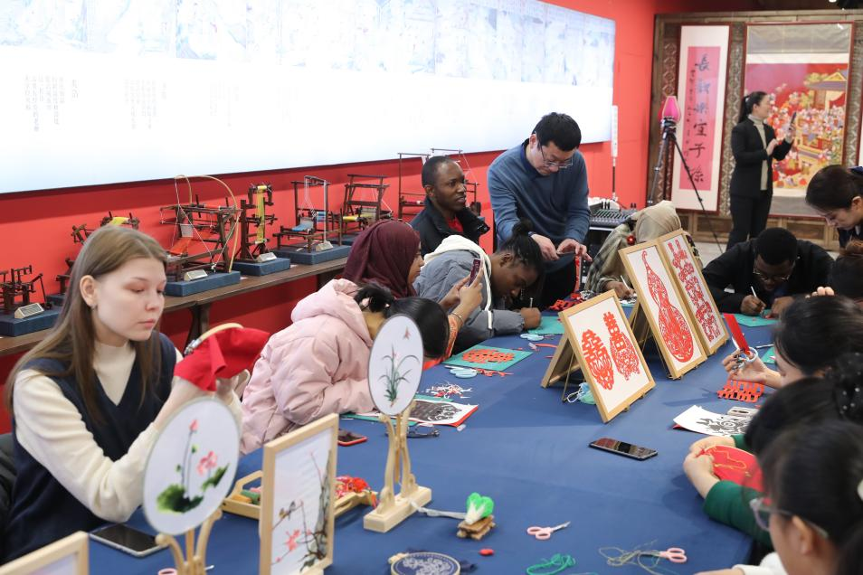 传统的婚俗展示让人沉浸在幸福喜悦的氛围之中,同时,还有剪纸、刺绣等传统活动,吸引了众多观众朋友,尤其是外国友人前来体验,为婚礼送上祝福。现场的各位观众朋友,手执针线,认真仔细地刺绣着如意福寿三多香包,祝福吉祥如意、多福多寿。还有巧手剪“喜”字窗花,在体验中,感受中国传统婚俗文化的魅力。