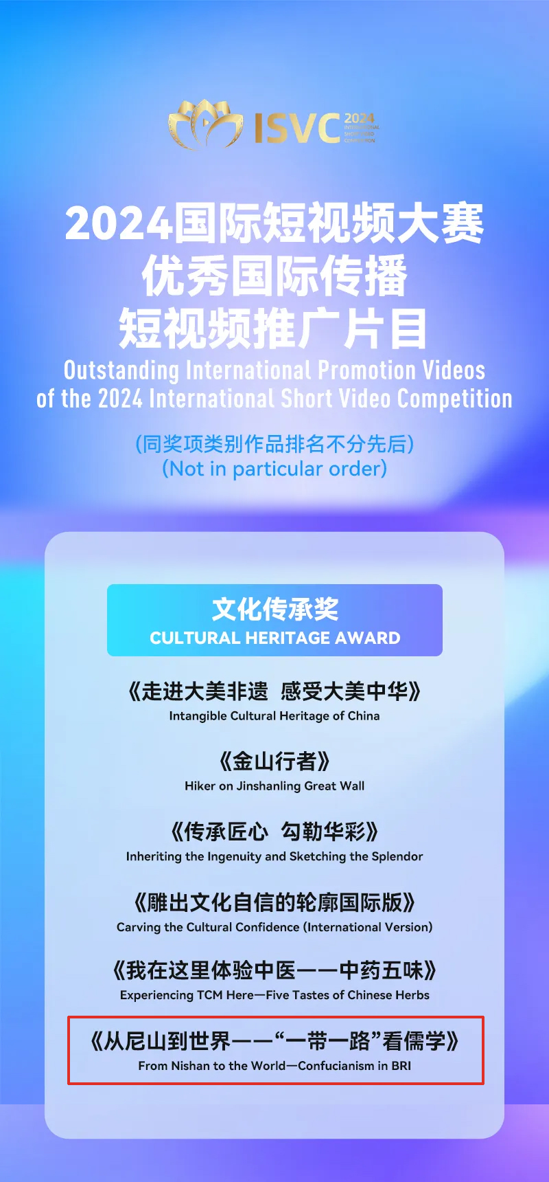 近日,由国家广播电视总局国际合作司、网络视听节目管理司共同指导,山东省广播电视局、泰安市人民政府主办的2024国际短视频大赛成果发布暨2025国际短视频大赛启动仪式圆满举行。活动现场揭晓《优秀国际传播短视频推广片目》,由尼山世界儒学中心(中国孔子基金会秘书处)报送的《从尼山到世界——“一带一路”看儒学》获2024国际短视频大赛“文化传承奖”。