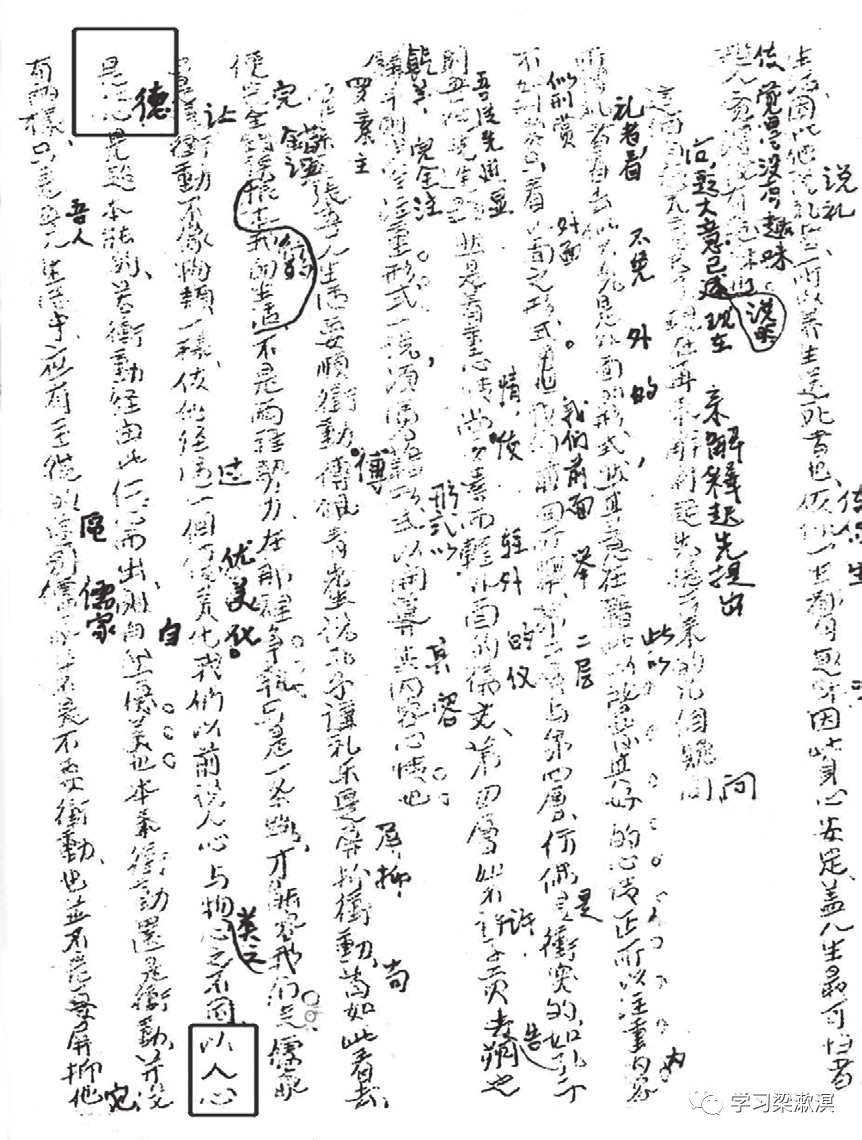 “呆定的东西”词语,则不落入概念牵制,又有特指,其词义指向明确 :凝滞呆板,一种固化 ;无疑更为生动传神、不含糊地直接去描述和呈现其本质 :“也可说礼乐孝弟是同样的情形,就是由里面灵活的、自然的心体,到后来形诸外面,成为许多事为(呆定的东西)此即由个人生活本体落入社会生活事用问题。”在此后的文字中,我们也看到 :