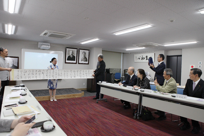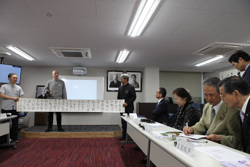 中国孔子基金会副秘书长刘廷善向関西吟诗文化协会赠送著名书画大家陈全胜为此次活动书写的书法长卷