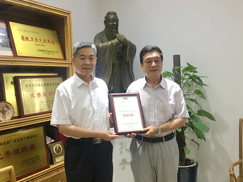 邢成湖代表孔子基金会向马传凯颁发了“孔子学堂文化大使”聘书,马传凯向中国孔子基金会赠送了他的《论语精言》书法作品。