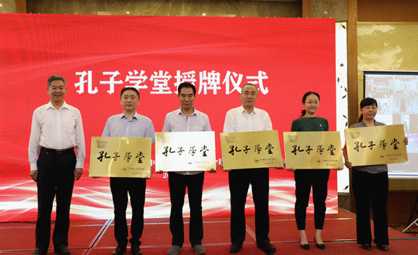 尼山世界儒学中心(中国孔子基金会秘书处)党委委员、副秘书长邢成湖为新批复孔子学堂代表授牌,周静为孔子学堂推进委员会部分代表颁发聘书