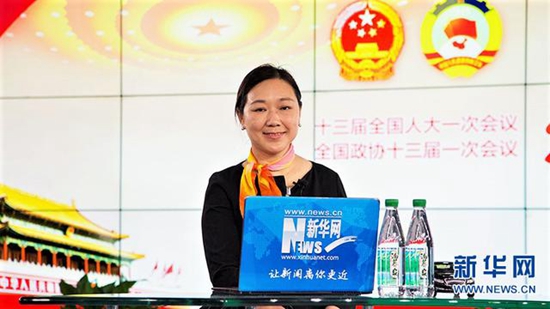 全国人大代表、作家、编剧蒋胜男做客新华网2018全国两会特别访谈。新华网 马江摄