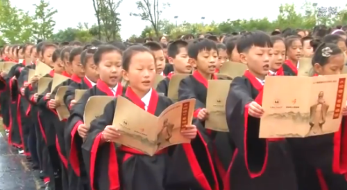 请全场庄严肃立,整理衣冠,面谒先师孔子行鞠躬礼!