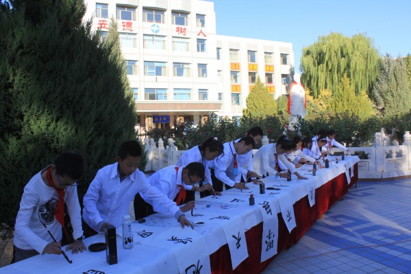 黄守雄、杨莹老师演唱《孔子之歌》《孔子》,张掖四中副校长鞠勤、教师刘学军及初一年级学生现场书写儒家经典名句。
