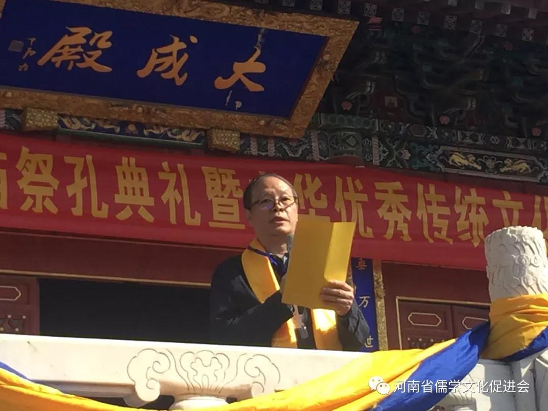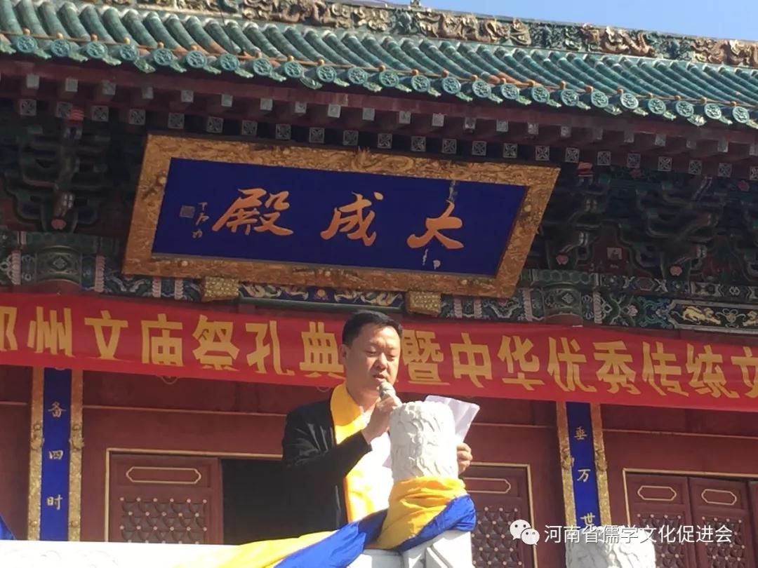 河南省儒学文化促进会会长徐东彬和郑州市商城遗址管理处主任马玉鹏先后致辞,徐东彬在祭孔大典上致辞,他指出,孔子是中国儒学的创始人。两千余年来,儒家思想对中国的影响不仅体现在政治、文化等方面,也体现在每一个中国人的行为和思维方式之中。孔子的思想不仅对中国文化产生了深远的影响,而且对亚洲乃至世界许多国家的文化也产生了深远的影响。地处中原的河南,是中华传统文化的重要发祥地,弘扬中华优秀传统文化河南责无旁贷。河南省儒学文化促进会自成立以来,做了大量的工作,产生了积极的影响,儒学爱好者的队伍不断壮大。让我们团结一心、齐心协力,遵照习近平总书记在党的十九大报告中的指示,深入挖掘中华优秀传统文化蕴涵的思想观念、人文精神、道德规范,结合时代要求继承创新,在让中华文化展现永久魅力和时代风采的伟大事业中做出我们应有的贡献!