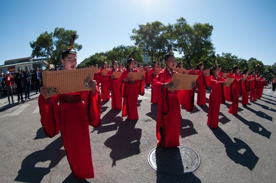武威文庙,万仞宫墙之外,千名学子身穿华丽的汉服,齐声吟诵儒家经典《大学》和《中庸》。同学们的声音震撼全场,泱泱华夏,薪火传承,感染着每一位在场的师生、观众以及国外游客。