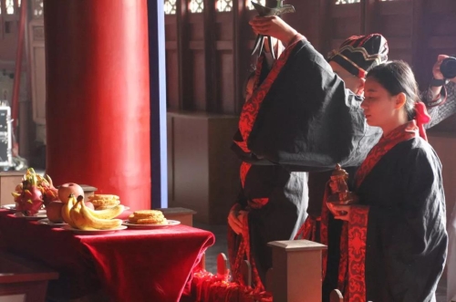 9点28分,大明湖畔、大成殿前,身着汉服的祭祀官、学子虔诚礼拜孔子。仪式包括参礼嘉宾向孔子敬献花篮、盥洗、拜上香、酹酒、恭读祭文、行四拜礼等环节。最后全体参礼人员和现场观众齐诵《大学》。