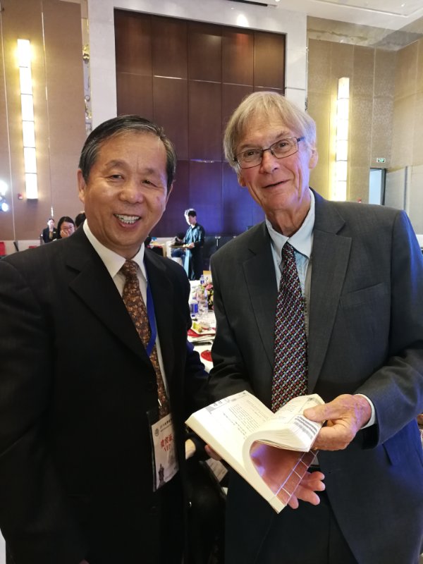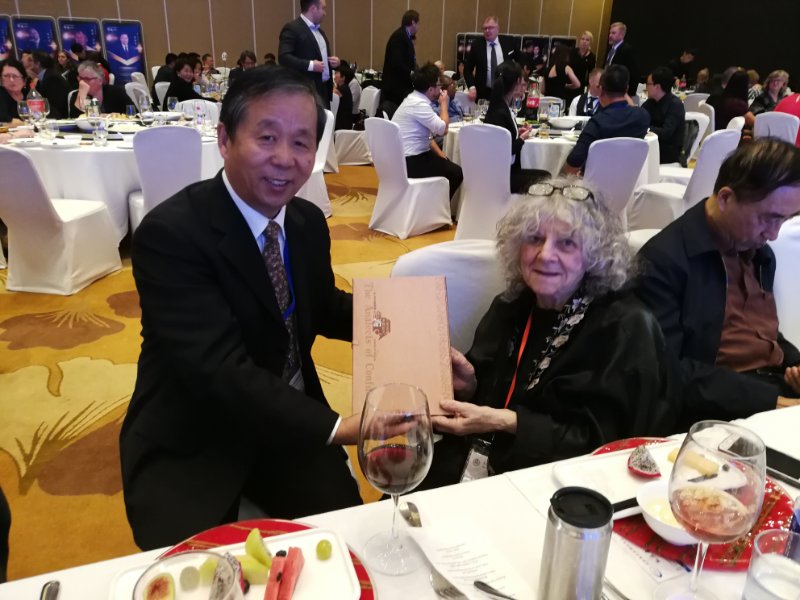 牛廷涛副秘书长向2001年诺贝尔生理医学奖得主、英国伦敦大学学院名誉教授Tim Hunt博士赠送中英版《论语》