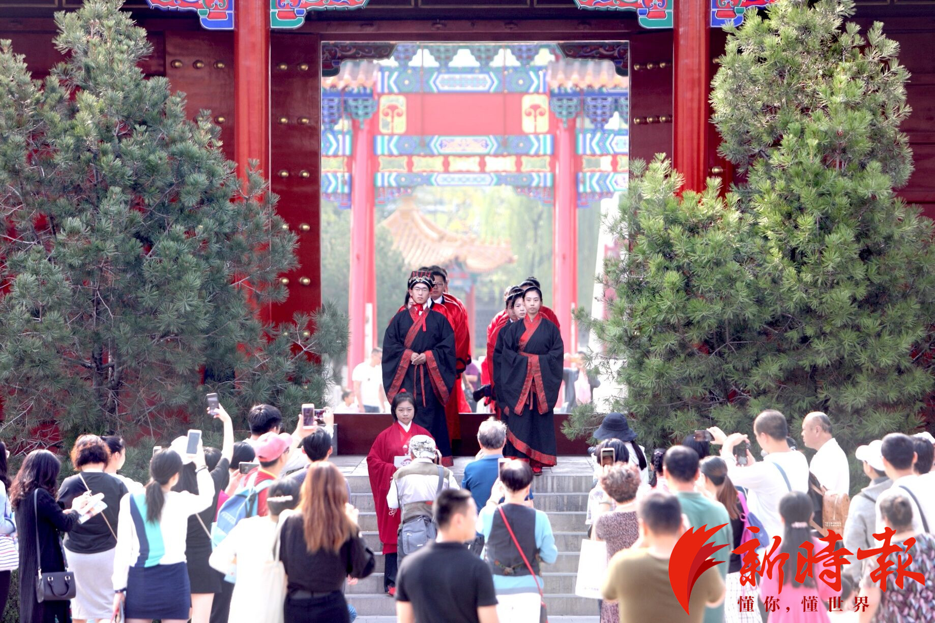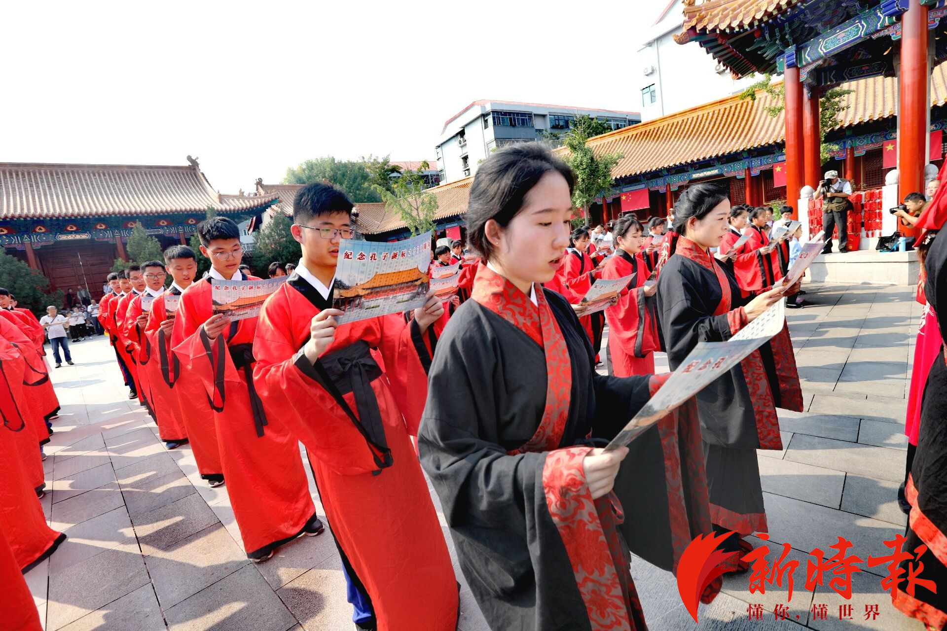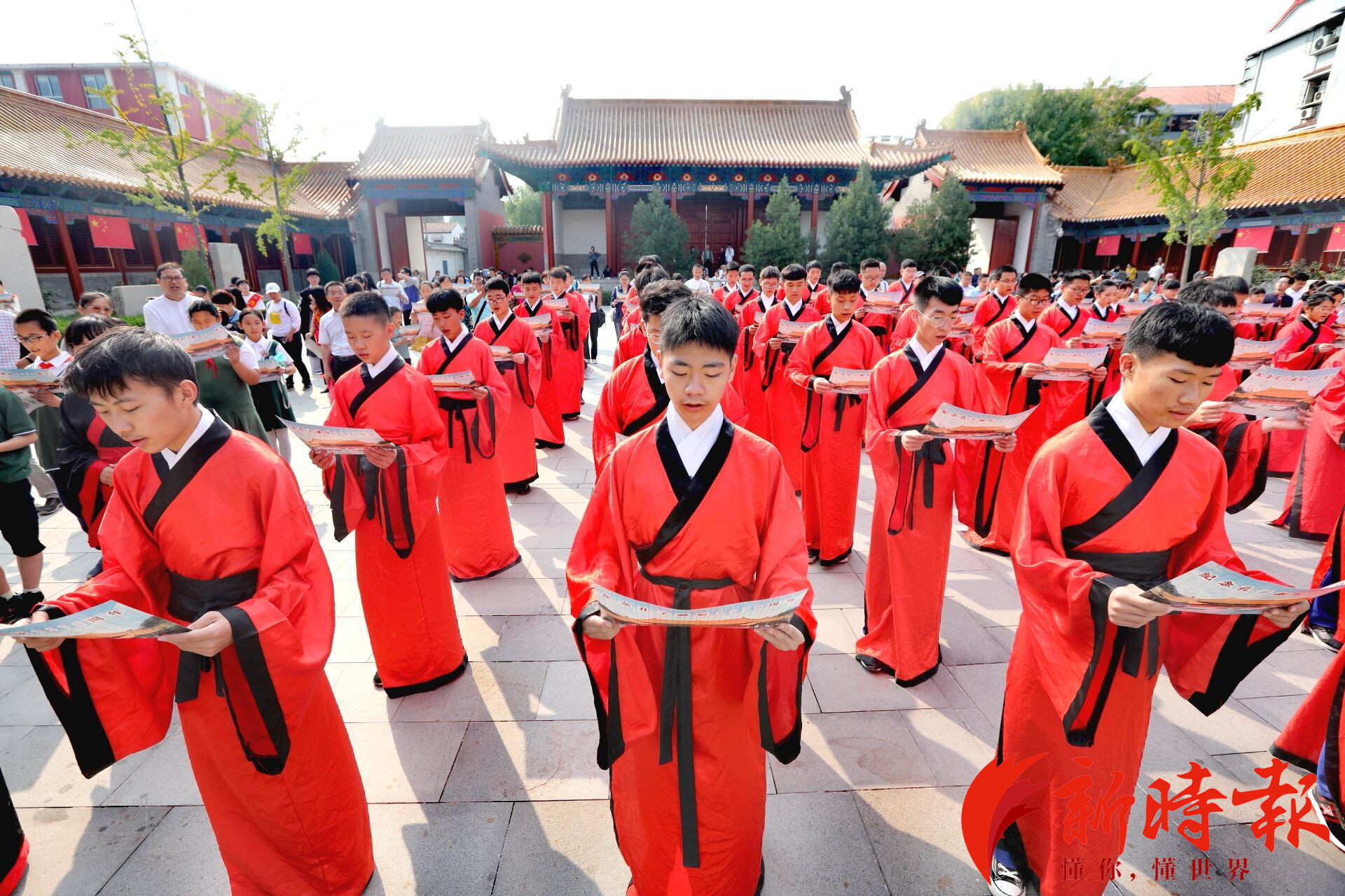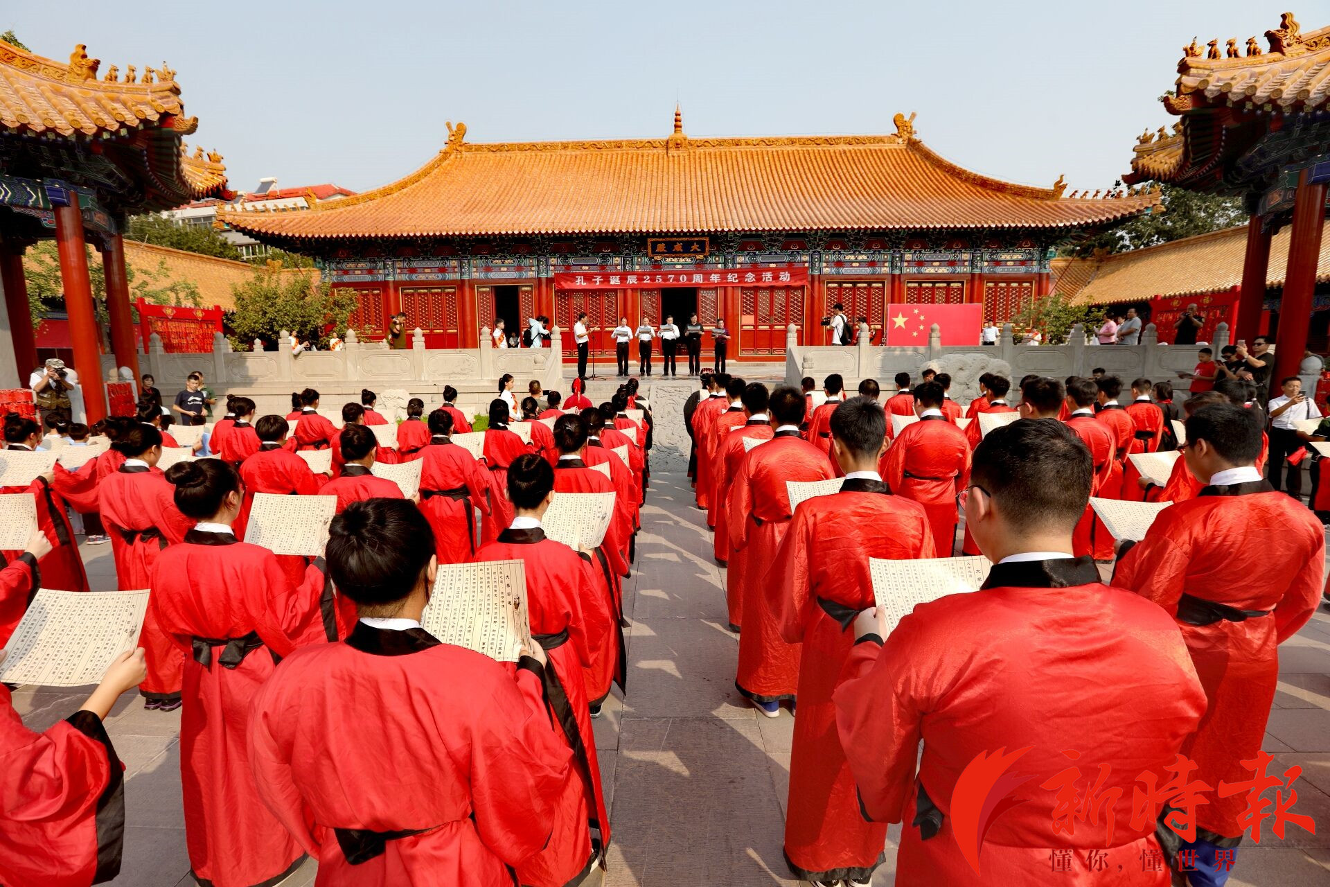 9月28日,济南府学文庙举办孔子诞辰2570周年纪念活动。70名学生身穿汉服在大成殿门前进行了拜孔仪式,并与现场市民一起诵读《大学》,在现场浓厚的国庆氛围中,感受传统文化魅力,弘扬时代精神。