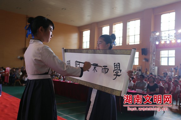 让孔子思想融合在新时代的实践中,此次活动还举行了“红书签,爱满星城”捐书仪式,岳麓区第二小学向雨敞坪镇中心小学捐赠图书1151本。在现场,岳麓区第二小学还被授予“长沙市文明校园”荣誉称号。最后,活动在教师代表《礼赞中国》的美妙歌声中掀起高潮。