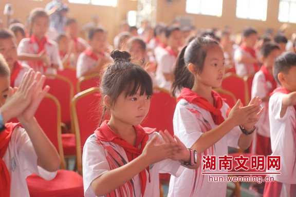 老师带领孩子们行礼。图片来源:湖南文明网 记者 彭团 摄