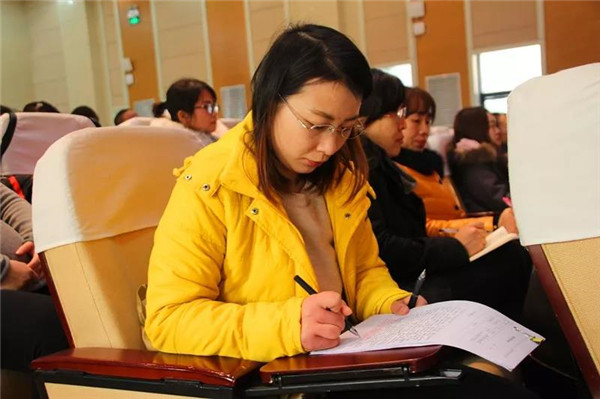 现场一百多位市中区的老师们认真跟随张卫东先生一句一句地吟诵,随着《论语》语句的语境、张先生的抑扬顿挫、先生敲击“醒木”的节奏而起承转合、铿锵有力。时而正色告诫,时而温煦随和;有时悲痛如泣,有时欢愉欲歌……这一切被张老师演绎地惟妙惟肖,活灵活现,好似让经典文字活了起来,让纸上的文字立体了起来……不经意间,就把经典语句印在了心里,将一幅幅有血有肉的、充满生命活力的汉字图形融入了生命,滋养了心灵。果然,吟诵是最好最早的视听练耳、天纵之声,以这种方式记忆经典、陶冶情操,毫不费力,花开蒂落、水到渠成。