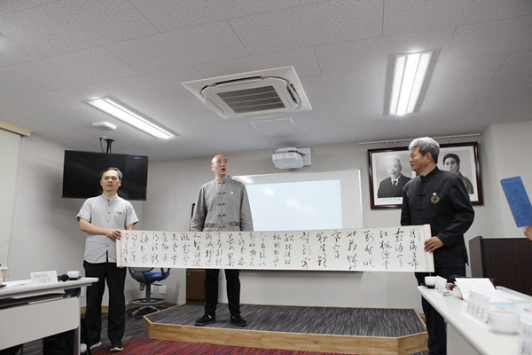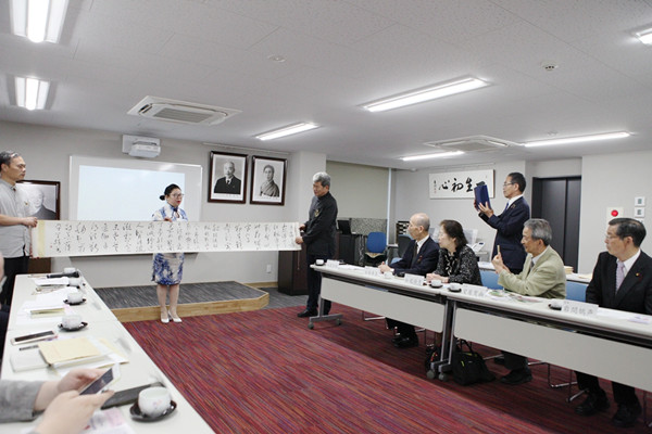 在交流活动中,曹琴给两国友人赠送了湖南省吟诵学会会长史鹏湘语吟诵光盘和长沙嘤鸣诗社《嘤鸣》刊物,以及她创作的书法作品,并向与会者介绍了中国吟诵和湖湘吟诵的历史和现状。
