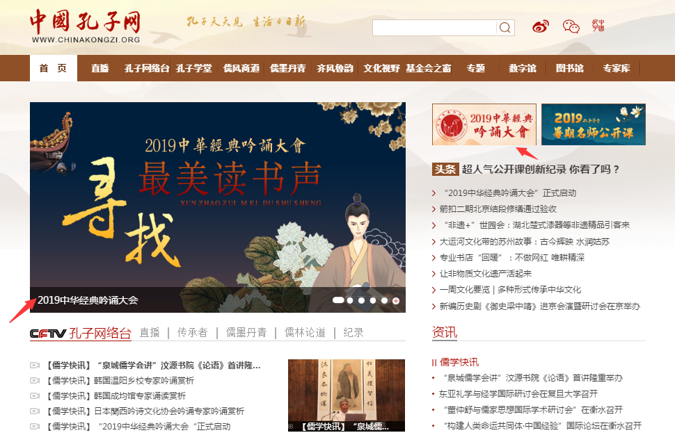用中国声音讲好中国故事,用经典之声传承中华文脉。“2019中华经典吟诵大会”官方网站已于近日上线,7月8日起,参赛选手可以登录中国孔子网或下载孔子网APP,在“2019中华经典吟诵大会”专题页面进行报名及作品上传。期待您的积极参与!