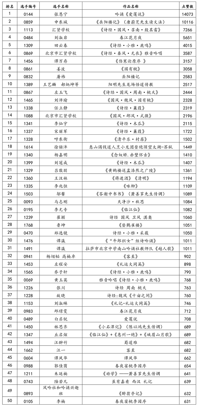 为了传播吟诵绝学,弘扬中华优秀传统文化,展示选手吟诵风采,让更多的人了解中国传统读书方法,“2019中华经典吟诵大会”8月3日至9日开通“点赞最美读书声”环节,共有20多万人次积极参与,现将网络点赞排名前五十名名单公布如下: