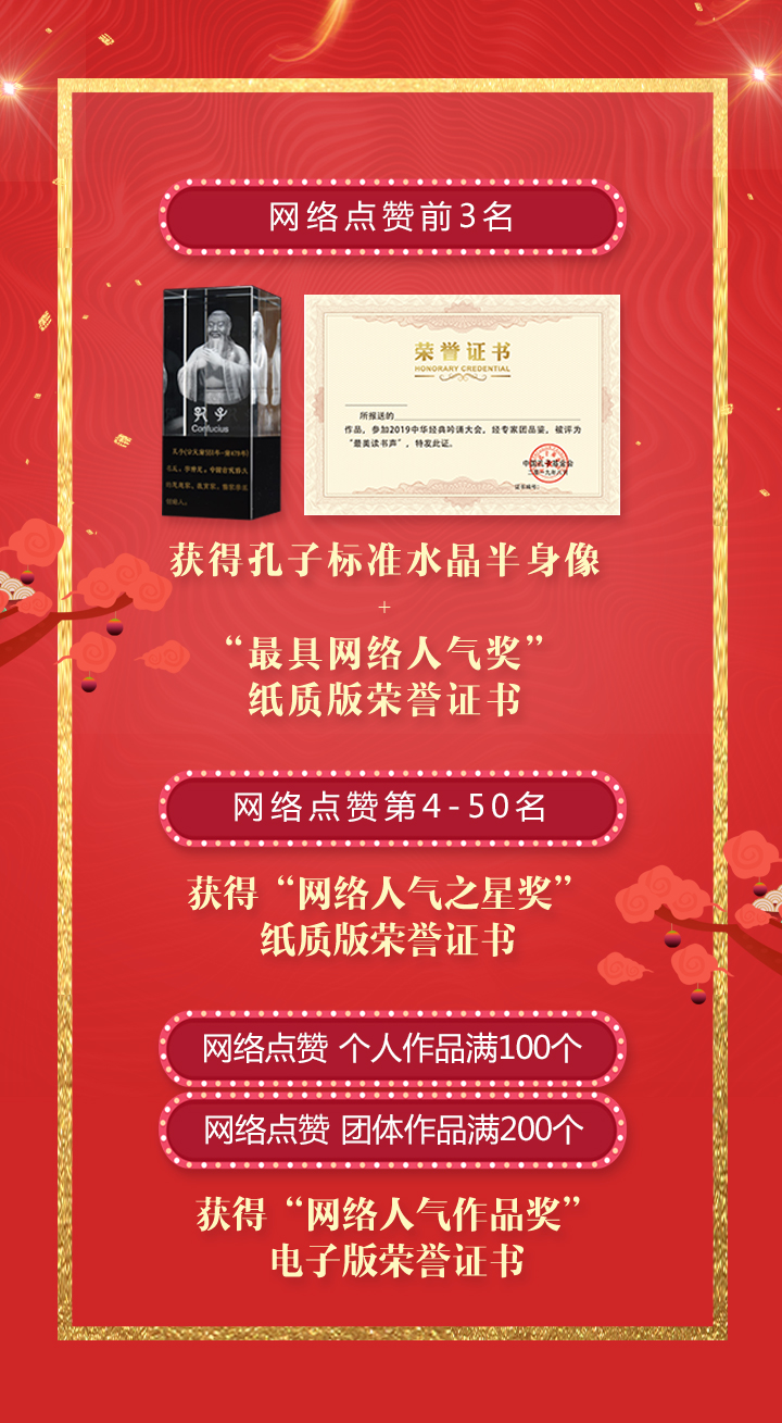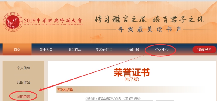 即日起所有参会选手均可通过中国孔子网网站(PC端)登陆吟诵大会专题页面的“个人中心-我的荣誉”下载电子证书,8月26日起组委会将陆续邮寄纸质证书和奖品。