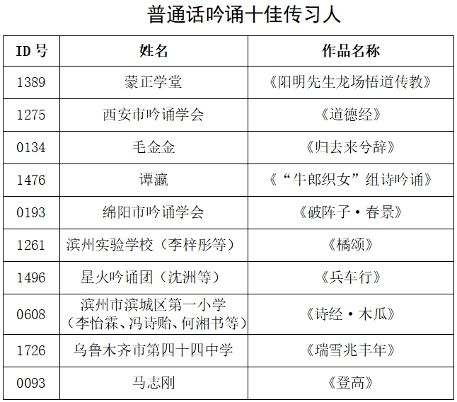 山西省河东吟诵社、山东省尼山书院吟诵学社、北京市教育学会吟诵教育研究会、四川省吟诵学会、唐山孔子学堂推广指导委员会、固镇县吟诵学会、大连市吟诵学会、鹤岗市吟咏诵读文艺家协会、湖北襄阳市吟诵学会、西安市吟诵学会、湖南吟诵学会、福建省吟诵学会、北京市昌平区汇贤学校、浙江温州市吟诵学会、唐山市吟诵协会、广东省惠州市吟诵协会、湖南长沙红卫小学、佛山市顺德区美的学校、河南省濮阳吟诵学会、河南省吟诵学会、云南省曲靖市吟诵协会、襄阳市传统文化教育研究会、贵阳蒙正学堂、广东省汕头市龙湖实验中学、山东冠县二小孔子学堂、山东泰山职业技术学院、上海市市北中学、济南市莱芜区花园学校孔子学堂、陕西省宝鸡孔子学堂推广委员会、连海书院、明道堂经学馆、山西新绛西街北校、山西临猗棒棒堂教育学校、山西运城市蓝海小学、河东吟诵社太原基地、太原交通广播华伊读书会、河东吟诵社河津基地、运城市解放路第三小学、运城市新康国际学校、日照市金海岸小学