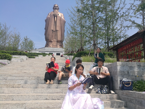 游学尼山圣境,在孔子塑像脚下读经典。尼山是孔子诞生地,远眺72米高的孔子像吸引热爱中华传统文化的海内外仁人志士前来参观。孔子仁爱、和而不同的理念影响着当今世界,唐山孔子学堂致力于传统文化的传承,通过每周一次公益经典读书活动,将经典文化得以在百姓中生根发芽,受到唐山地区广大群众关注和喜爱。吟诵团在尼山圣地,在孔子塑像下齐读经典篇章《大学》,不仅是对传统文化的遵循,更是身体力行传承传统文化的具体行动。“读好书、写好字、做好人”责在吾辈。