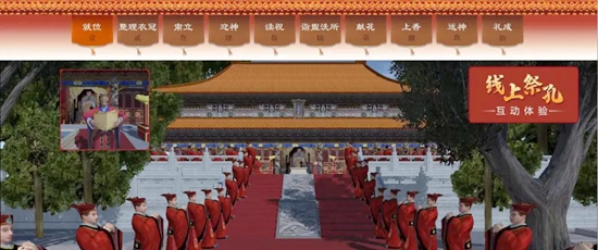 中国孔子网对“线上祭孔”平台进行了优化升级。采用虚拟现实、短视频、H5互动等多种技术手段,重现古代祭孔场面。平台由国内权威礼乐专家指导,模拟还原了“就位、整理衣冠、肃立、迎神、读祝、诣盥洗所、献花、上香、送神、礼成”十个祭孔流程,人们可以通过互动点播在虚拟现实中完成祭孔,感受一场规范隆重、庄严肃穆的仪式,以表达对孔子的感念与尊崇。
