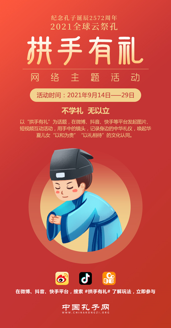 “2021全球云祭孔”活动还面向广大受众,以及海外华人华侨、留学生,启动“我心中的孔子”微视频征集活动。同时在抖音、快手、微博等平台开展“拱手有礼”短视频话题挑战活动,用手中的镜头记录中华礼仪,唤起华夏儿女以和为贵、以礼相待的文化认同。