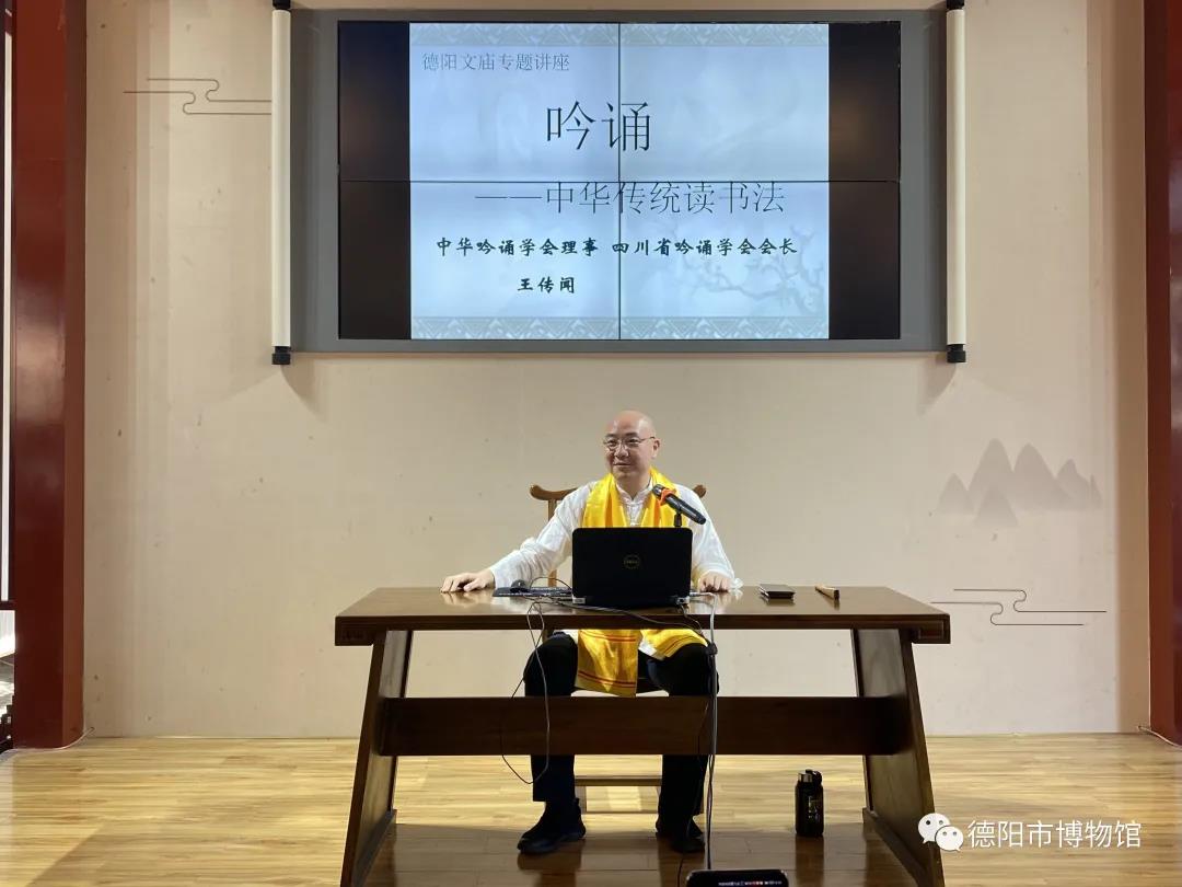 9月28日下午,中华吟诵学会理事、四川省吟诵学会会长王传闻受邀在德阳文庙讲堂开展了“吟诵——中华传统读书法”专题讲座,并赠予德阳市博物馆《四川传统吟诵研究》著作一套。
