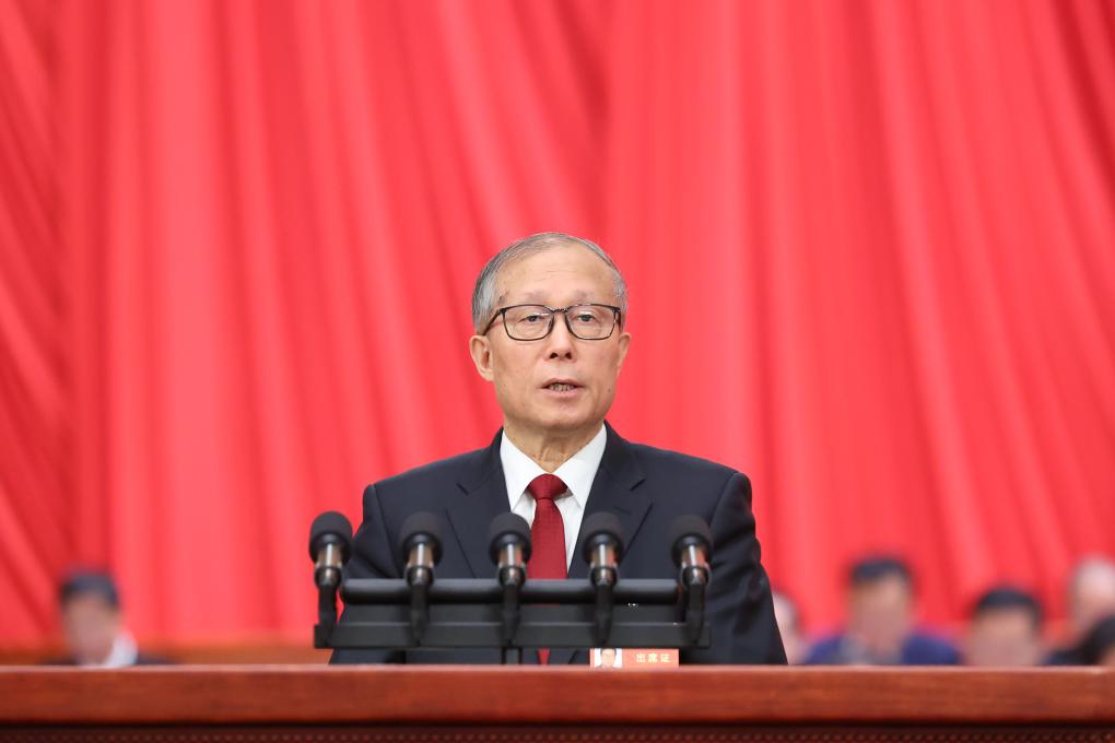 Li Hongzhong, vice chairman of the National People's Congress (NPC) Standing Committee, explains a draft revision to the Organic Law of the State Council at the opening meeting of the second session of the 14th NPC at the Great Hall of the People in Beijing, capital of China, March 5, 2024. (Xinhua/Liu Weibing)