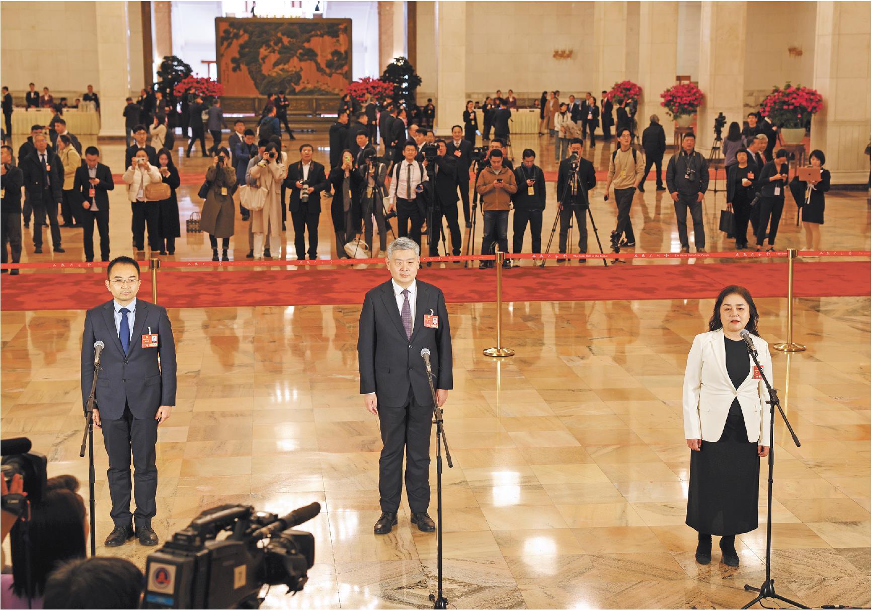 □记者卢鹏报道 3月4日,全国政协十四届三次会议首场“委员通道”在北京人民大会堂一层中央大厅开启。全国政协委员黄绵松(左起)、金李、乔红接受记者提问。