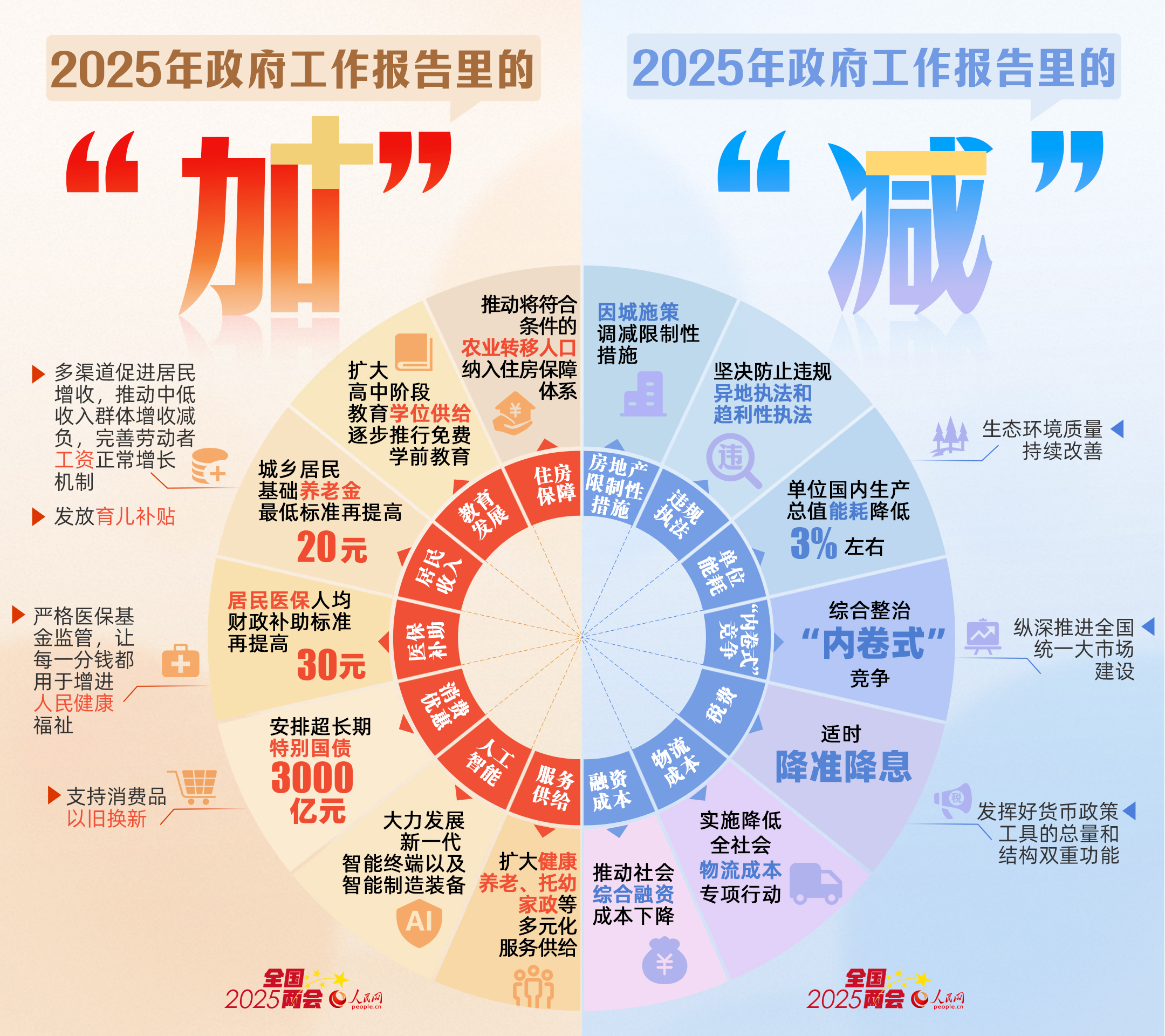 养老金提高20元,3000亿元国债支持消费品以旧换新,发放育儿补贴……今年政府工作报告里的这些民生举措,让你我的钱包“鼓起来”;综合整治“内卷式”竞争,因城施策调减房地产限制性措施等也将深刻影响我们的生活。“加”的暖心,“减”的舒心,新的一年,持则可圆!