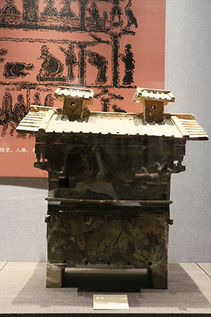 陶仓为泥质灰陶,平面呈长方形,顶部及仓体分别烧纸而成。悬山式顶,一条正脊,两端各有扁平垂脊,顶部正脊上有两个两面坡式天窗以备通风,仓楼顶部及天窗顶部均密布瓦陇,顶檐之下前面及两侧均有一斗三升的斗拱承挑檐枋。仓身正面中部伸出四个梁头承托平台。仓门位于仓正面左上侧,为方形。仓正面底部分别列五个通风孔。仓房底部四角各一扁方形空心柱状足。此器表面施朱色彩绘,除正面承托平台的梁头下隐约可见朱绘斗拱外,还见朱绘方格纹样。