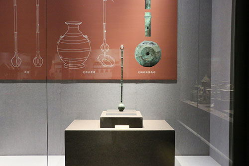 青铜汲酒器设计巧妙,竹管状长柄,下接平底、中空、形如荷蕾的球形器。柄外表为四竹节形,上、下各饰一周箍状纹,柄端封闭并饰龙首衔环。在龙首之下第二竹节处有一长方孔,球形器底部中央有一圆孔,两孔互相贯通。使用时,手握柄入酒水中。球形器进酒水后,手指按压柄上方的孔洞,同时提出器物,将球形器移入接盛酒水的酒具,松开按压柄部孔洞的手指,酒水即进入酒具。