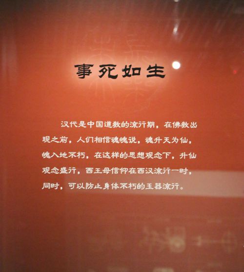 汉代是中国道教的流行期,在佛教出现之前,人们相信魂魄说,魂升为天仙,魄入地不朽,在这样的思想观念下,升仙观念盛行,西王母信仰在西汉流行一时,同时,可以防止身体不朽的玉器流行。