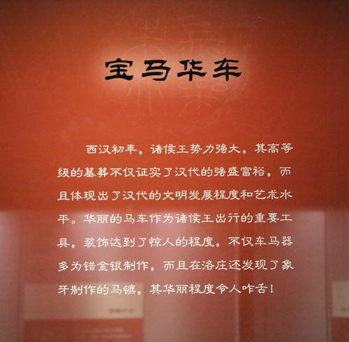 西汉初年,诸侯王势力强大,其高等级的墓葬不仅证实了汉代的强盛富裕,而且体现了出了汉代的文明发展程度和艺术水平。华丽的马车作为诸侯王出行的重要工具,装饰达到了惊人的程度,不仅车马器多为错金银制作,而且在洛庄还发现了象牙制作的马镳,其华丽程度令人咋舌!