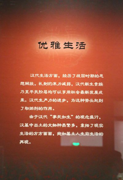 汉代生活方面,经历了战国时期的思想解放,礼制约束力减弱,汉代新生贵族乃至平民阶层可以享用社会最新发展成果。汉代生产力的进步,为这种势头起到了助燃剂的作用。由于汉代“事死如生”的观念盛行,汉墓中出土的文物种类繁多,囊括了现实生活的方方面面,宛如墓主人生前生活的再现。
