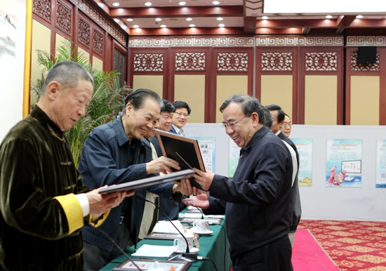 国际儒学联合会会长滕文生(左二)为获奖者万俊人教授颁奖。