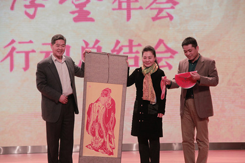 著名剪纸艺术家卢雪女士在年会现场向孔子学堂赠送了她的剪纸作品,中国孔子基金会副理事长邢成湖为山东快书表演艺术家阴军和著名剪纸艺术家卢雪颁发“孔子学堂文化大使”荣誉证书,并对两位艺术家为传播孔子文化事业所作出的贡献表示感谢,希望以后有更多的合作交流,共同做好“孔子学堂”的推广和建设工作。