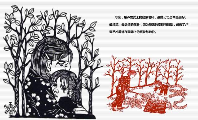 自1994年,卢雪开始先后赴瑞士、美国、新加坡、瑞典、丹麦、香港、台湾等二十多个国家和地区作艺术交流、展览、演讲,把中国古老的剪纸文化传播到欧、美、亚洲许多国家。被誉为“中国新一代成就卓越的剪纸艺术家和文化大使”。她先后创作了一系列传统文化经典作品,包括《孔子圣迹图》《二十四孝》《茶道》《十二生肖》《中国传统节日》《感念母亲》等,2012年获文化部中国非物质文化遗产保护中心颁发的“中华非物质文化遗产传承人薪传奖”。