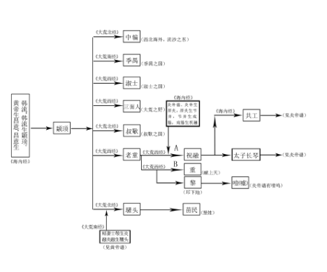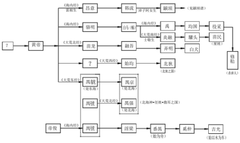 《海内经》:“流沙之东,黑水之西,有朝云之洞,司彘之国。黄帝妻雷祖,生昌意,昌意降处若水,生韩流,韩流擢首、谨耳、八面、豕喙、麟身、渠股、豚止,取淖了曰阿女,生帝颛顼”。由引文可得世系:黄帝——昌意——韩流——颛顼。