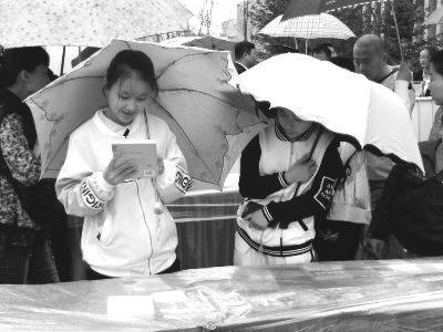 4月23日,吉林省“换书大集”活动现场,霏霏细雨中,5000余名群众现场捐赠、交换图书近万册。图为小读者兴致勃勃地在雨中挑选图书。 张海梅 摄