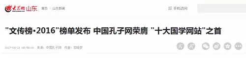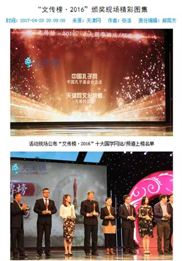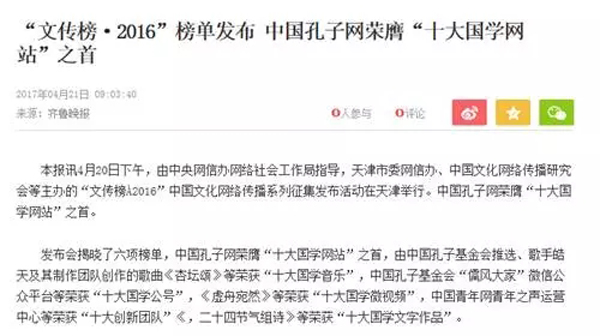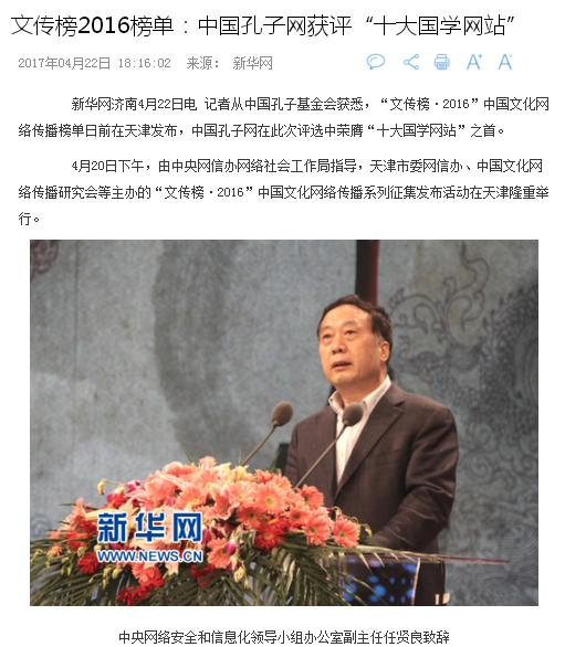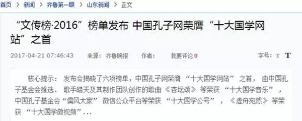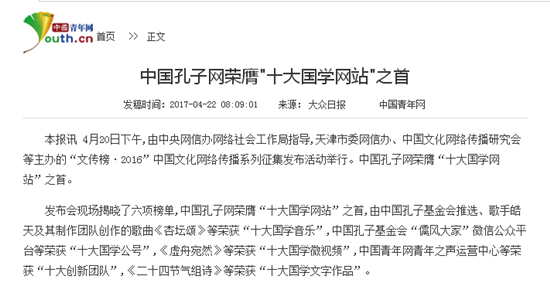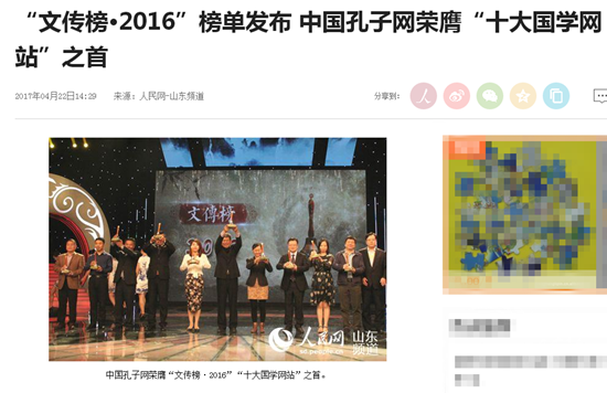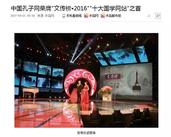 中国孔子网荣膺“文传榜·2016”“十大国学网站”之首