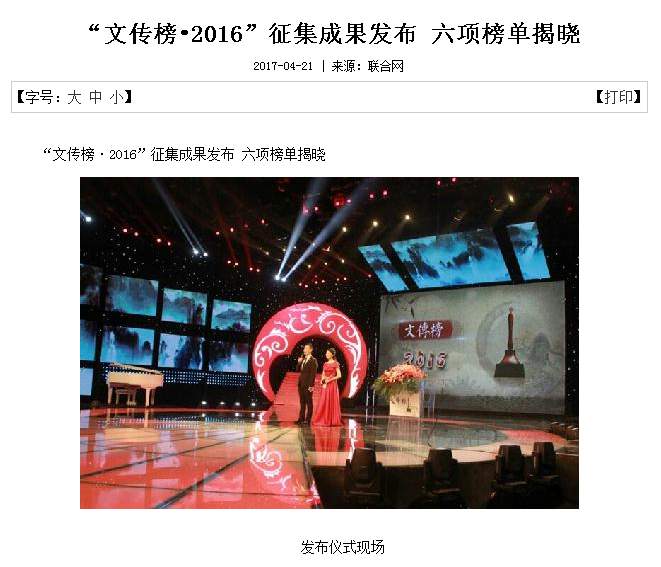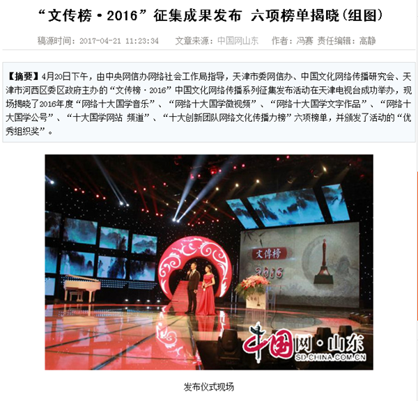4月20日下午,由中央网信办网络社会工作局指导,天津市委网信办、中国文化网络传播研究会、天津市河西区委区政府主办的“文传榜·2016”中国文化网络传播系列征集发布活动在天津召开。大会揭晓了2016年度网络“十大国学微视频”“十大国学音乐”“十大国学文字作品”“十大国学公号”“十大国学网站/频道”“十大创新团队”六项榜单以及优秀组织奖。