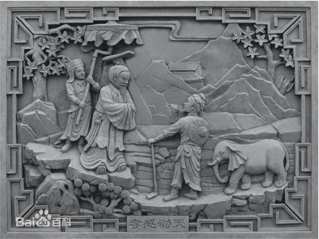 舜,传说中的远古帝王,五帝之一,姓姚,名重华,号有虞氏,史称虞舜。相传他的父亲瞽叟及继母、异母弟象,多次想害死他:让舜修补谷仓仓顶时,从谷仓下纵火,舜手持两个斗笠跳下逃脱;让舜掘井时,瞽叟与象却下土填井,舜掘地道逃脱。事后舜毫不嫉恨,仍对父亲恭顺,对弟弟慈爱。他的孝行感动了天帝。舜在厉山耕种,大象替他耕地,鸟代他锄草。帝尧听说舜非常孝顺,有处理政事的才干,把两个女儿娥皇和女英嫁给他;经过多年观察和考验,选定舜做他的继承人。舜登天子位后,去看望父亲,仍然恭恭敬敬,并封象为诸侯。后人有诗赞曰:队队春耕象,纷纷耘草禽。嗣尧登宝位,孝感动天心。