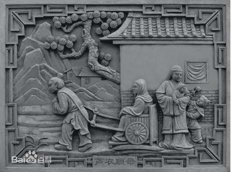 闵损,字子骞,春秋时期鲁国人,孔子的弟子,在孔门中以德行与颜渊并称。孔子曾赞扬他说:“孝哉,闵子骞!”(《论语·先进》)。他生母早死,父亲娶了后妻,又生了两个儿子。继母经常虐待他,冬天,两个弟弟穿着用棉花做的冬衣,却给他穿用芦花做的“棉衣”。一天,父亲出门,闵损牵车时因寒冷打颤,将绳子掉落地上,遭到父亲的斥责和鞭打,芦花随着打破的衣缝飞了出来,父亲方知闵损受到虐待。父亲返回家,要休逐后妻。闵损跪求父亲饶恕继母,说:“留下母亲只是我一个人受冷,休了母亲三个孩子都要挨冻。”父亲十分感动,就依了他。继母听说,悔恨知错,从此对待他如亲子。