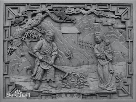 郭巨,晋代隆虑(今河南林县)人,一说河内温县(今河南温县西南)人,原本家道殷实。父亲死后,他把家产分作两份,给了两个弟弟,自己独取母亲供养,对母极孝。后家境逐渐贫困,妻子生一男孩,郭巨担心,养这个孩子,必然影响供养母亲,遂和妻子商议:“儿子可以再有,母亲死了不能复活,不如埋掉儿子,节省些粮食供养母亲。”当他们挖坑时,在地下二尺处忽见一坛黄金,上书“天赐郭巨,官不得取,民不得夺”。夫妻得到黄金,回家孝敬母亲,并得以兼养孩子。