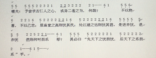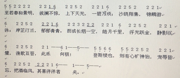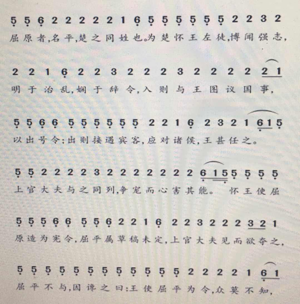 再一种是吟诵汉魏之后散文的调子,包括《史记·屈原列传》,诸葛亮《出师表》,韩愈《送李愿归盘谷序》,李华《吊古战场文》,欧阳修《秋声赋》《丰乐亭记》《五代史·伶官传序》《泷冈阡表》,范仲淹《岳阳楼记》,按照前几年的说法,其尾腔为“6 1 5”(实则是“2 1 6 1 5”,详见下文。),读来高亢、激昂。我们今天所传承的“唐调”主要就是尾腔为“2 1 6 1 5”的古文吟诵调。