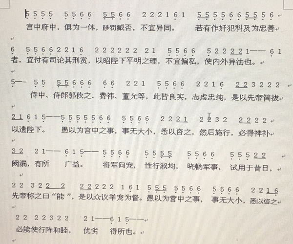 “2 1 6 ”偶尔也出现在句尾,但多不拖腔。如《出师表》: