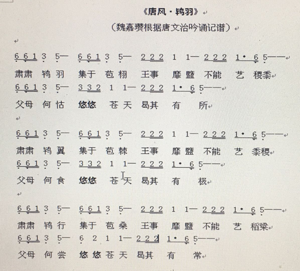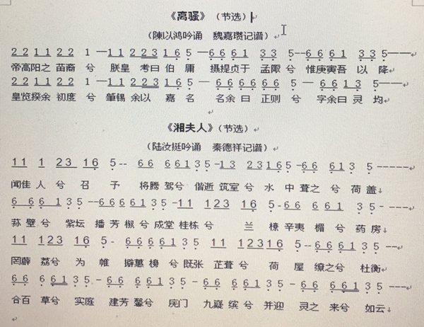 在唐文治和魏嘉瓒、陳以鸿、陆汝挺吟诵的《诗经》《楚辞》中,尽管低调和高调的顺序有所不同,但都有“2 2 2 2 1 6 5 ”或“2 2 2 3 1 6 5 ”这样的旋律,实际上就是由“2—1—6—5——”变化而来。