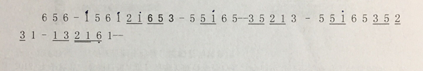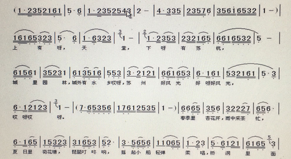 江南丝竹《紫竹调》开头一句即是:6 6 1 5 3 6 6 1 5 3 2 2 3 2 1 6 1--
