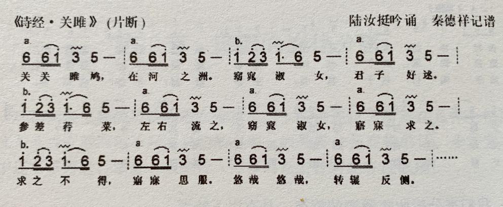 众所周知,唐调用同一个吟诵调子吟诵《诗经》和《楚辞》。以秦德祥先生所记谱对比前两句, “关关雎鸠”与“君不行兮夷犹”的旋律对比,后者比前者多了一个音节“6”,整句多了一个节拍;“在河之洲”与“蹇谁留兮中洲”的旋律对比,与第一句的处理一模一样,均是在句首加减音节,后者比前者多了一个节拍。虽然这两类诗体用的是同一个调子,但是由于吟咏的方法不同,音节的处理会存在差异,旋律也有比较大的变化,所以接下来的部分我们就不再进行对比了。