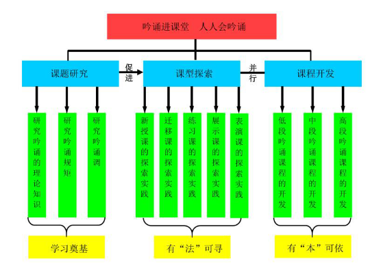 吟诵课程主要通过“1个基础”“3种形式”“5种课型”保障实施的扎实高效。